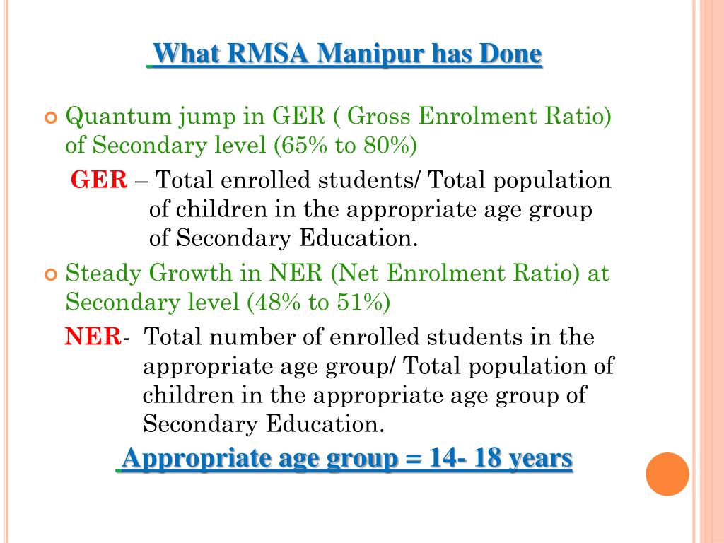 WhatRMSA Manipur has Done • Quantum jump in GER ( Gross Enrolment Ratio) of Secondary level (65% to 80%) GER – Total enrolled students/ Total population of children in the appropriate age group of Secondary Education. • Steady Growth in NER (Net Enrolment Ratio) at Secondary level (48% to 51%) NER- Total number of enrolled students in the appropriate age group/ Total population of children in the appropriate age group of Secondary Education. • Appropriate age group = 14- 18 years