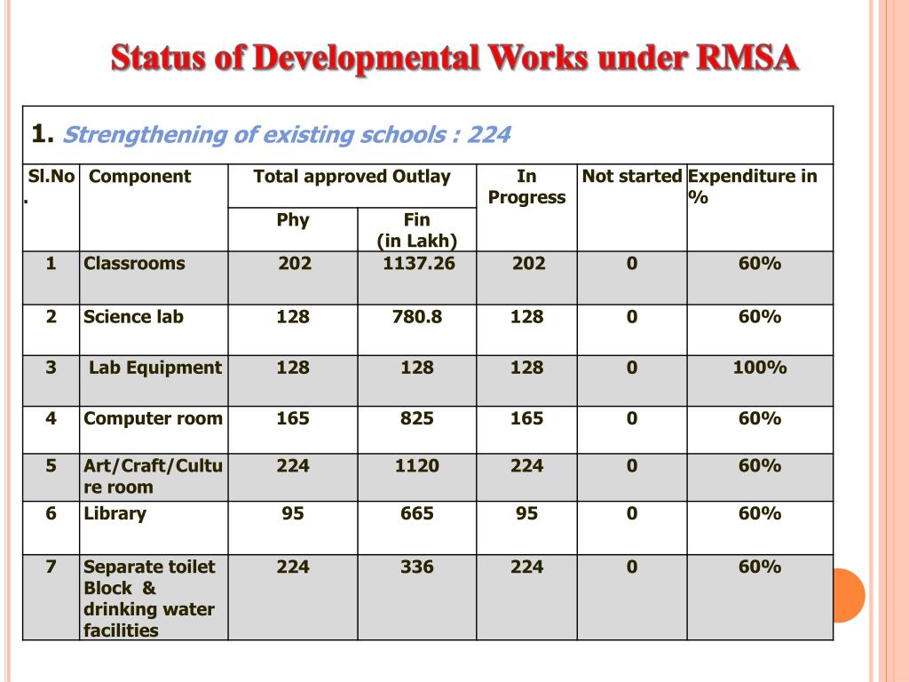 1. central Share yet to be recieved. Issues under RMSA, Manipur • 2009-10 – 40% 0f Civil works components • 2010-11- 51.54% of Civil works components • 2011-12 – 100% of Civil works components Serious Impediments in all upgraded 116 Secondary Schools due to Non – release of balance amount of civil works components
