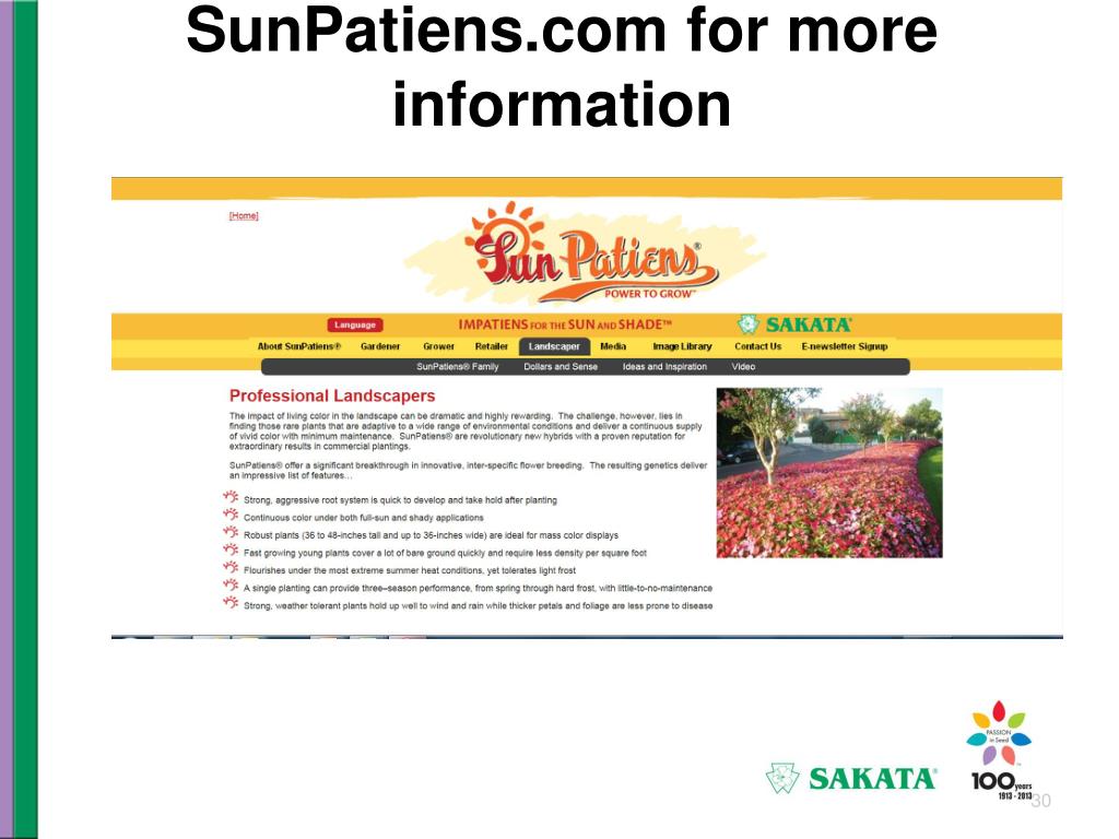 Dollars and Sense of SunPatiens® in the Landscape SunPatiens aggressive root system and plant vigor are quick to fill-in after transplant and provide greater coverage with fewer plants. In addition they continue to flower during the high heat of summer when traditional impatiens bloom out. www.sakataornamentals.com