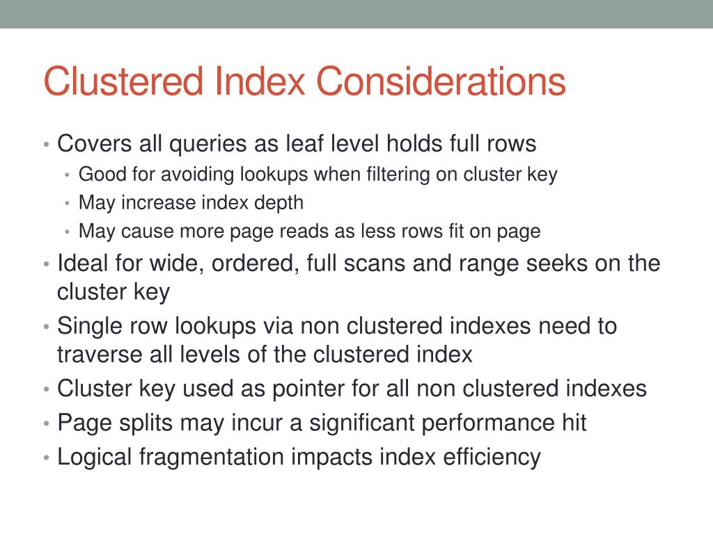 Clustered Index Considerations • Covers all queries as leaf level holds full rows • Good for avoiding lookups when filtering on cluster key • May increase index depth • May cause more page reads as less rows fit on page • Ideal for wide, ordered, full scans and range seeks on the cluster key • Single row lookups via non clustered indexes need to traverse all levels of the clustered index • Cluster key used as pointer for all non clustered indexes • Page splits may incur a significant performance hit • Logical fragmentation impacts index efficiency
