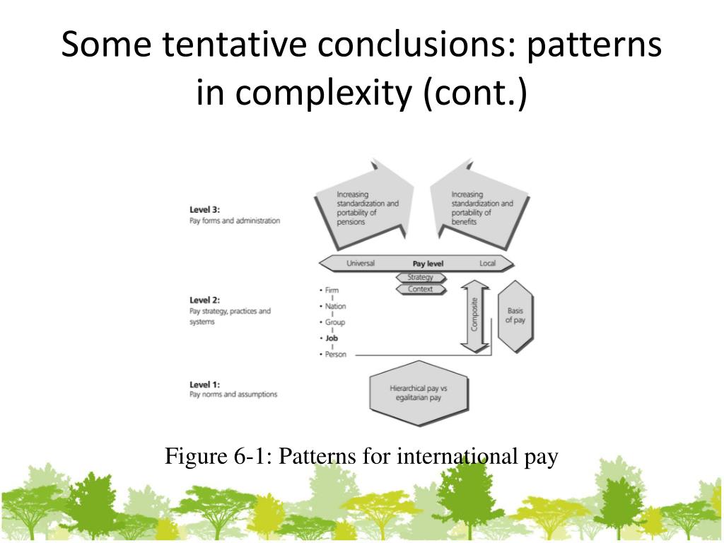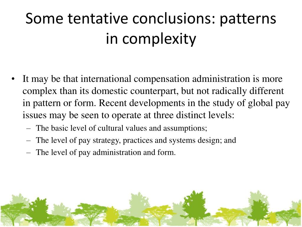 Some tentative conclusions: patterns in complexity • It may be that international compensation administration is more complex than its domestic counterpart, but not radically different in pattern or form. Recent developments in the study of global pay issues may be seen to operate at three distinct levels: • The basic level of cultural values and assumptions; • The level of pay strategy, practices and systems design; and • The level of pay administration and form.