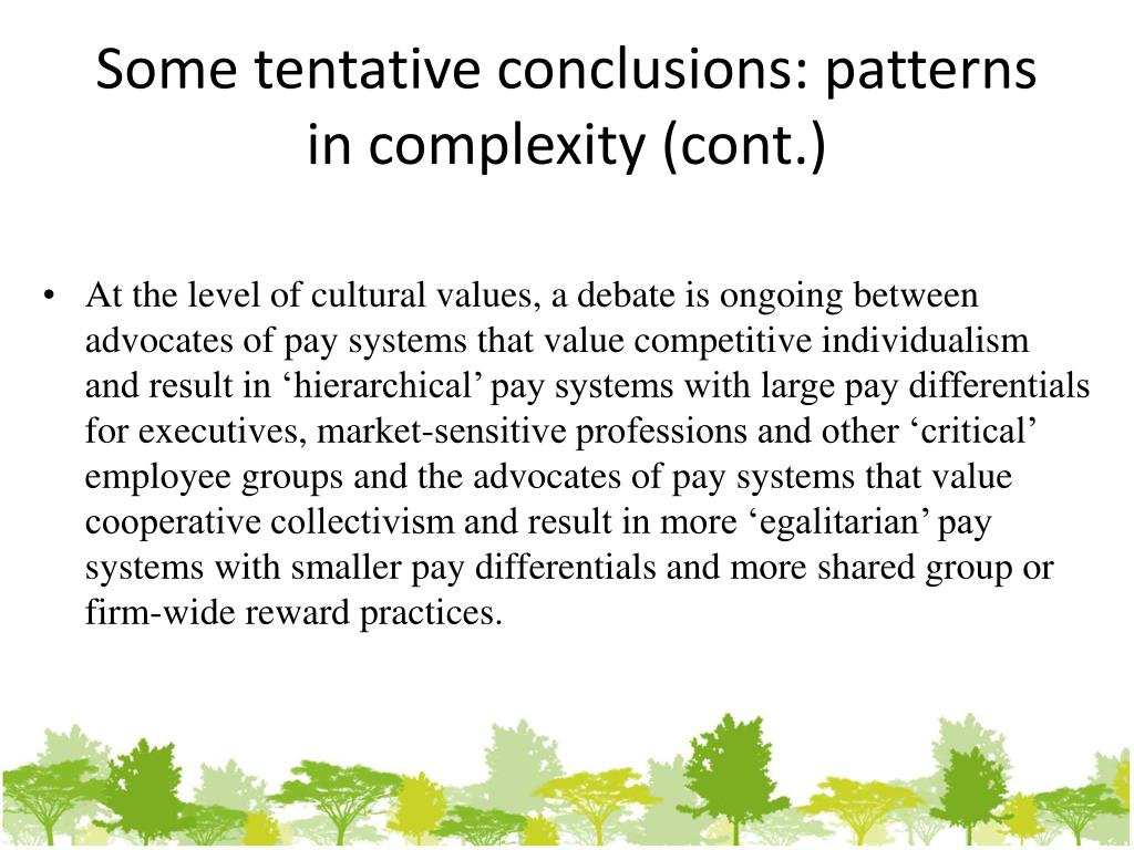Some tentative conclusions: patterns in complexity (cont.) • At the level of cultural values, a debate is ongoing between advocates of pay systems that value competitive individualism and result in ‘hierarchical’ pay systems with large pay differentials for executives, market-sensitive professions and other ‘critical’ employee groups and the advocates of pay systems that value cooperative collectivism and result in more ‘egalitarian’ pay systems with smaller pay differentials and more shared group or firm-wide reward practices.
