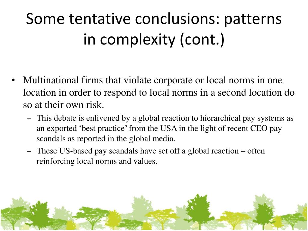 Some tentative conclusions: patterns in complexity (cont.) • Multinational firms that violate corporate or local norms in one location in order to respond to local norms in a second location do so at their own risk. • This debate is enlivened by a global reaction to hierarchical pay systems as an exported ‘best practice’ from the USA in the light of recent CEO pay scandals as reported in the global media. • These US-based pay scandals have set off a global reaction – often reinforcing local norms and values.