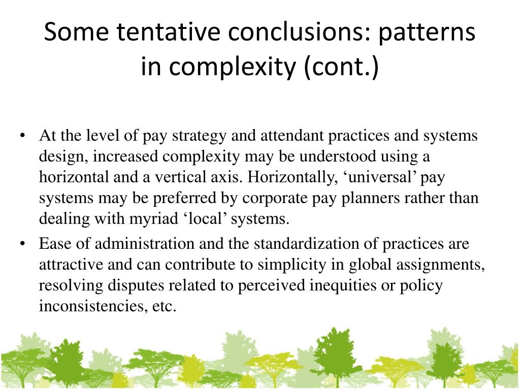 Some tentative conclusions: patterns in complexity (cont.) • At the level of pay strategy and attendant practices and systems design, increased complexity may be understood using a horizontal and a vertical axis. Horizontally, ‘universal’ pay systems may be preferred by corporate pay planners rather than dealing with myriad ‘local’ systems. • Ease of administration and the standardization of practices are attractive and can contribute to simplicity in global assignments, resolving disputes related to perceived inequities or policy inconsistencies, etc.