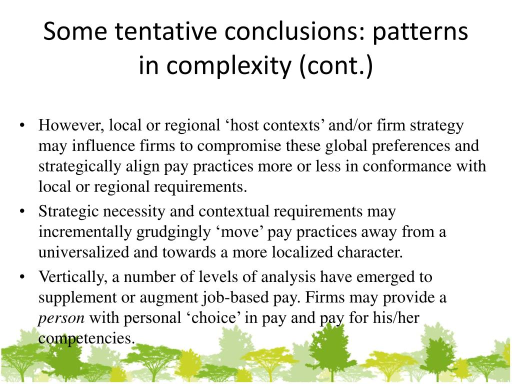 Some tentative conclusions: patterns in complexity (cont.) • However, local or regional ‘host contexts’ and/or firm strategy may influence firms to compromise these global preferences and strategically align pay practices more or less in conformance with local or regional requirements. • Strategic necessity and contextual requirements may incrementally grudgingly ‘move’ pay practices away from a universalized and towards a more localized character. • Vertically, a number of levels of analysis have emerged to supplement or augment job-based pay. Firms may provide a person with personal ‘choice’ in pay and pay for his/her competencies.