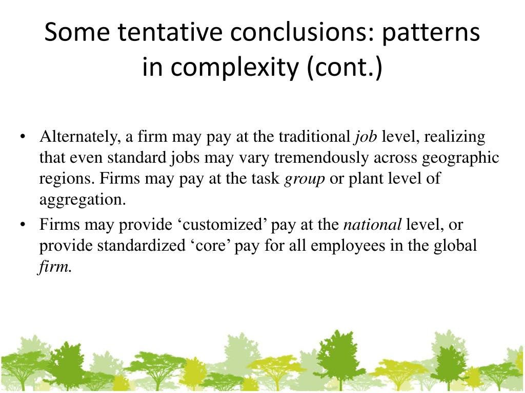 Some tentative conclusions: patterns in complexity (cont.) • Alternately, a firm may pay at the traditional job level, realizing that even standard jobs may vary tremendously across geographic regions. Firms may pay at the task group or plant level of aggregation. • Firms may provide ‘customized’ pay at the national level, or provide standardized ‘core’ pay for all employees in the global firm.