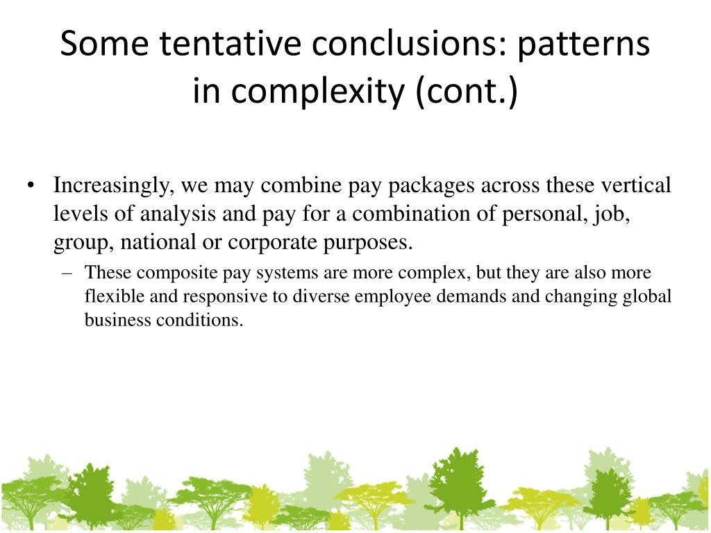 Some tentative conclusions: patterns in complexity (cont.) • Increasingly, we may combine pay packages across these vertical levels of analysis and pay for a combination of personal, job, group, national or corporate purposes. • These composite pay systems are more complex, but they are also more flexible and responsive to diverse employee demands and changing global business conditions.