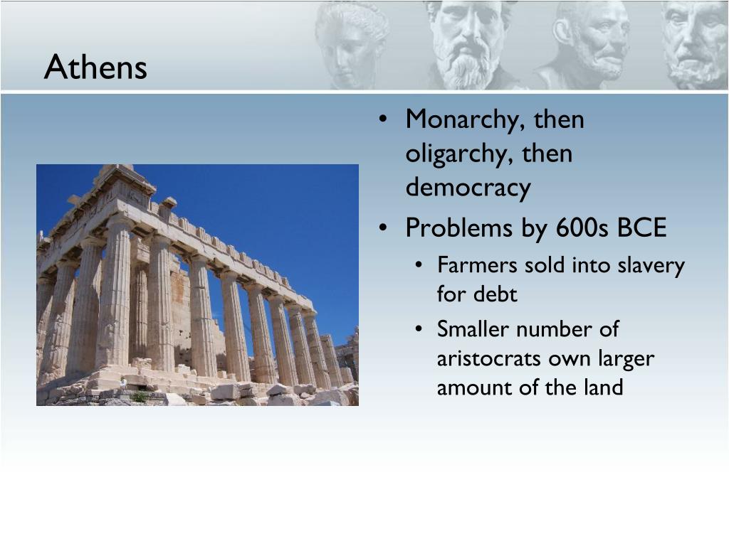 Athens • Monarchy, then oligarchy, then democracy • Problems by 600s BCE • Farmers sold into slavery for debt • Smaller number of aristocrats own larger amount of the land