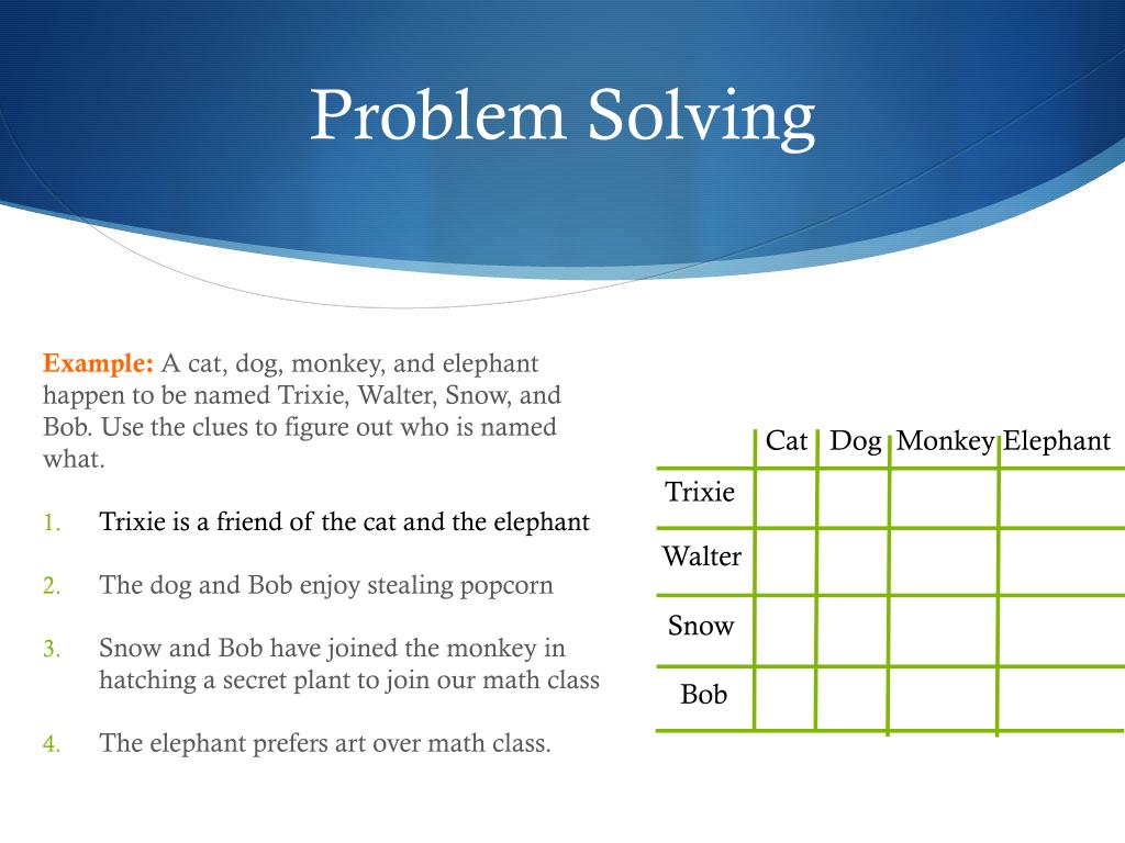 Problem Solving Sometimes we’re faced with questions that take more than just steps to figure out. Example: A cat, dog, monkey, and elephant happen to be named Trixie, Walter, Snow, and Bob. Use the clues to figure out who is named what. • Trixie is a friend of the cat and the elephant • The dog and Bob enjoy stealing popcorn • Snow and Bob have joined the monkey in hatching a secret plant to join our math class • The elephant prefers art over math class.