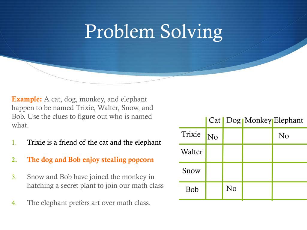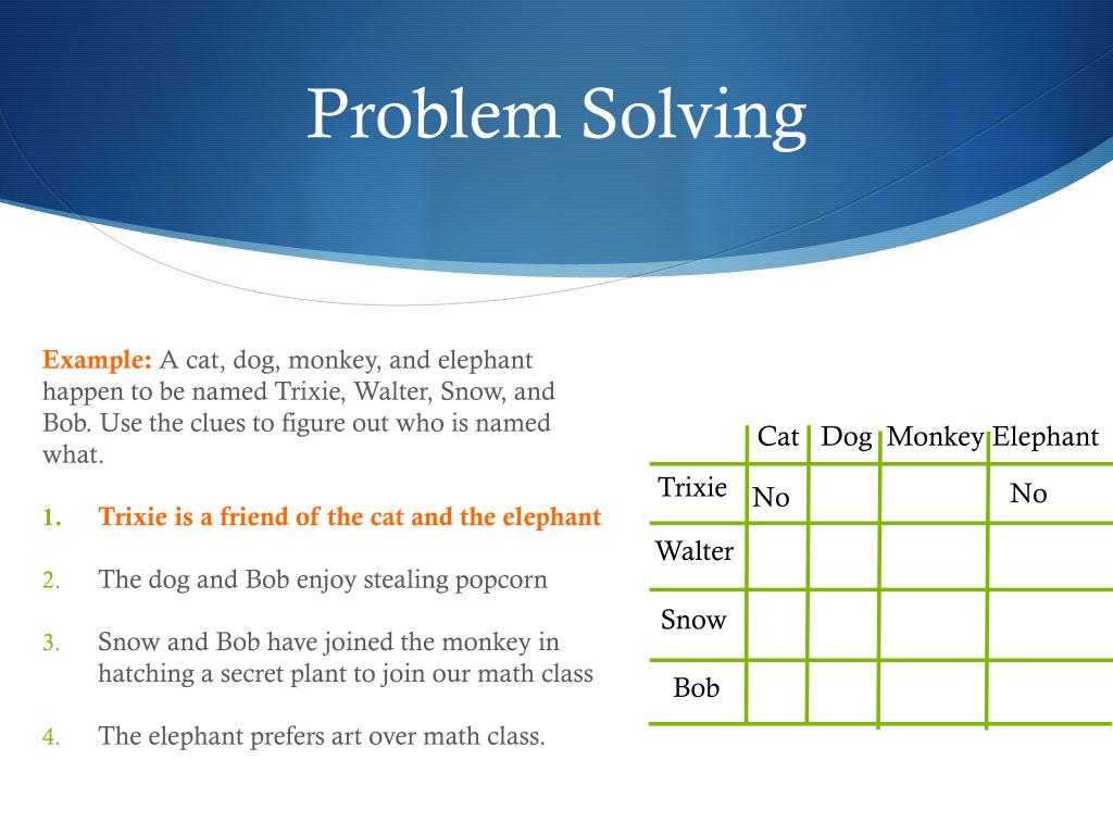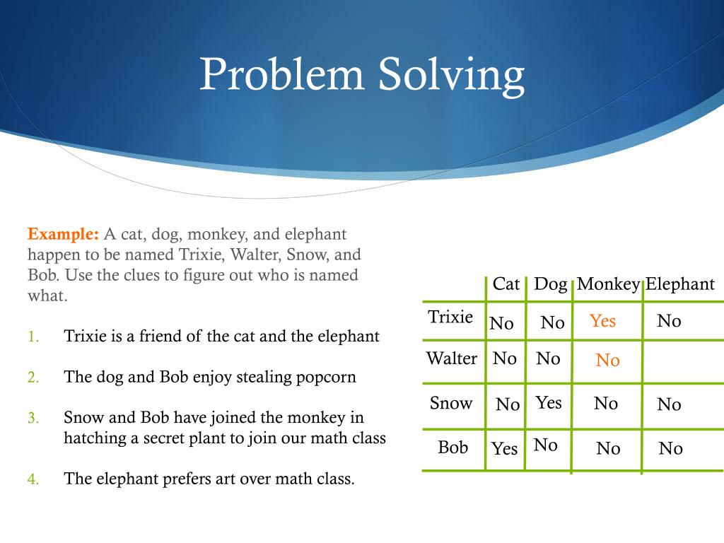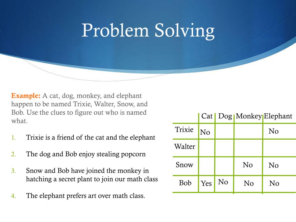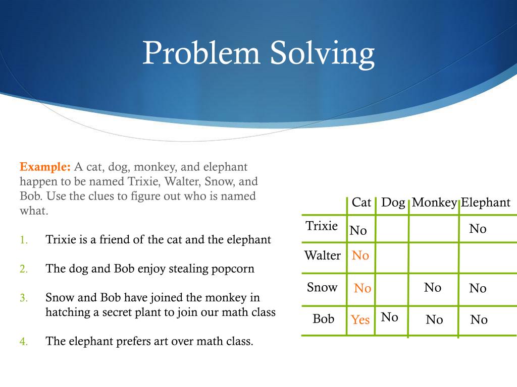 Problem Solving Example: A cat, dog, monkey, and elephant happen to be named Trixie, Walter, Snow, and Bob. Use the clues to figure out who is named what. • Trixie is a friend of the cat and the elephant • The dog and Bob enjoy stealing popcorn • Snow and Bob have joined the monkey in hatching a secret plant to join our math class • The elephant prefers art over math class. Cat Dog Monkey Elephant Trixie Yes No No No Walter No No No Yes Snow No No No No Bob No No Yes