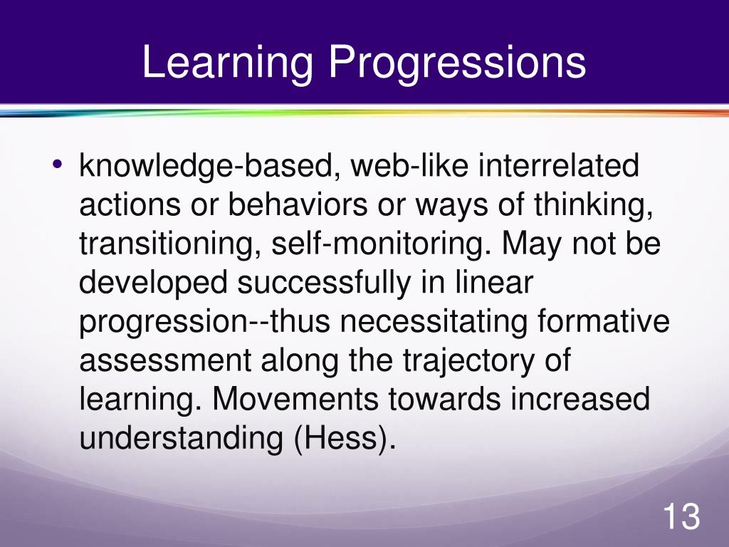 Learning Progressions • knowledge-based, web-like interrelated actions or behaviors or ways of thinking, transitioning, self-monitoring. May not be developed successfully in linear progression--thus necessitating formative assessment along the trajectory of learning. Movements towards increased understanding (Hess).