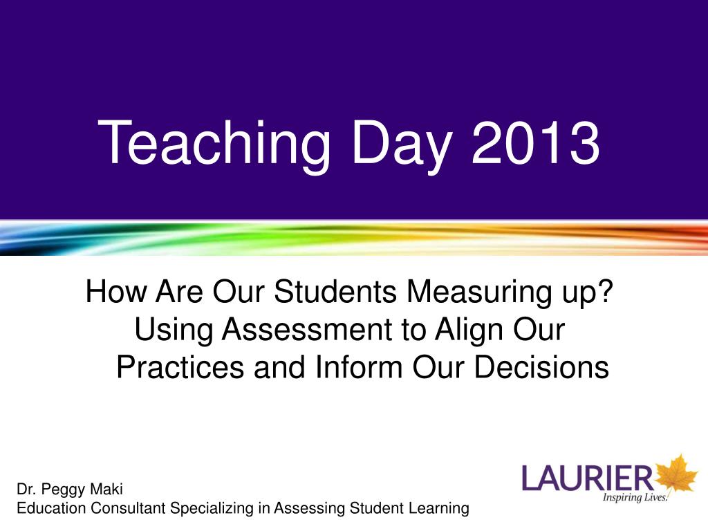 Teaching Day 2013 How Are Our Students Measuring up?Using Assessment to Align Our Practices and Inform Our Decisions Dr. Peggy Maki Education Consultant Specializing in Assessing Student Learning