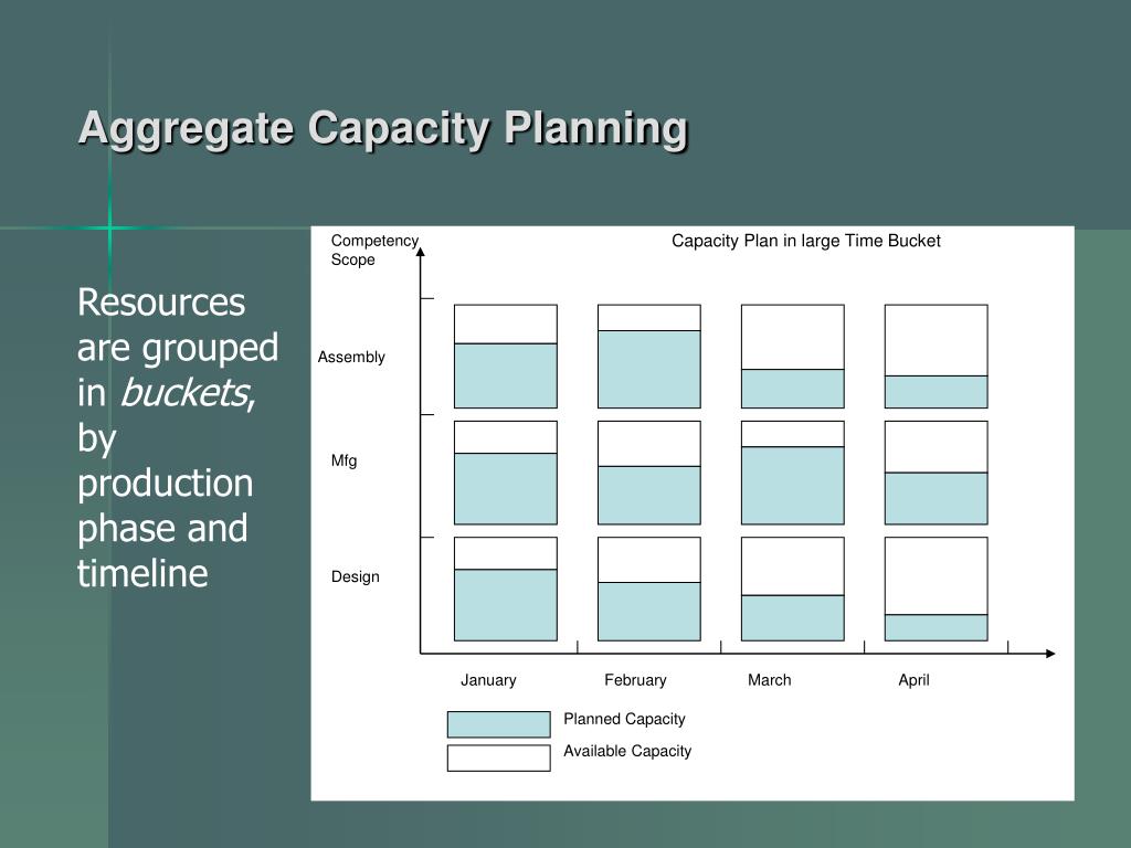 Capacity Plan in large Time Bucket Competency Scope Assembly Mfg Design January February March April Planned Capacity Available Capacity Aggregate Capacity Planning Resources are grouped in buckets, by production phase and timeline