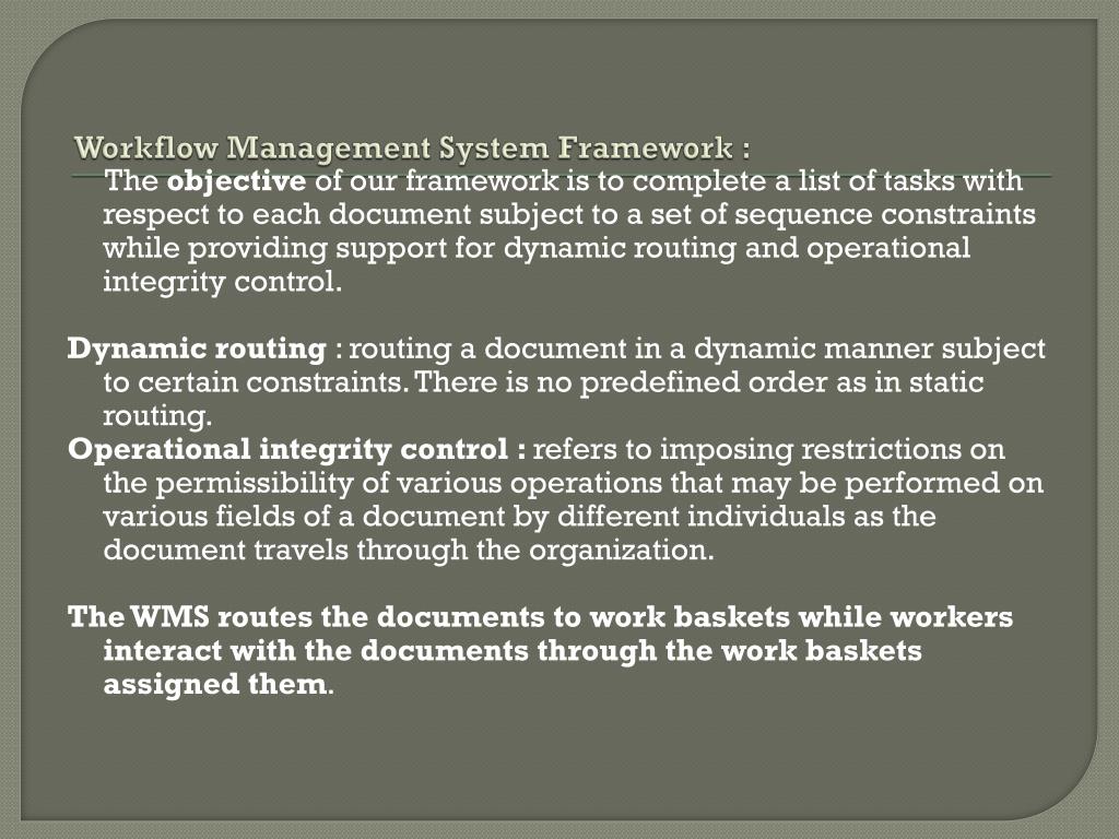 Workflow Management System Framework : The objective of our framework is to complete a list of tasks with respect to each document subject to a set of sequence constraints while providing support for dynamic routing and operational integrity control. Dynamic routing : routing a document in a dynamic manner subject to certain constraints. There is no predefined order as in static routing. Operational integrity control : refers to imposing restrictions on the permissibility of various operations that may be performed on various fields of a document by different individuals as the document travels through the organization. The WMS routes the documents to work baskets while workers interact with the documents through the work baskets assigned them.