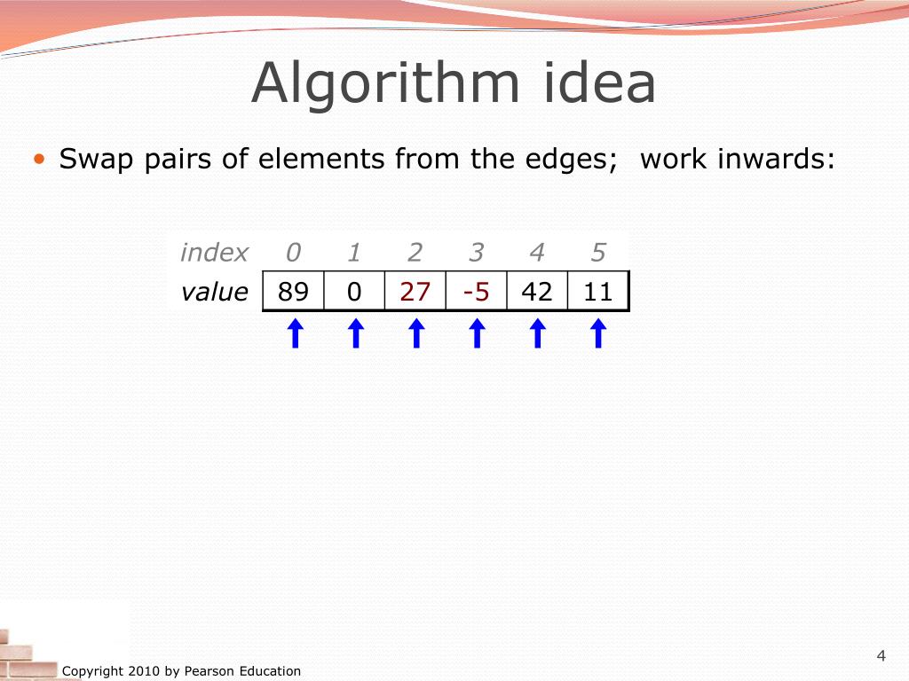 Algorithm idea • Swap pairs of elements from the edges; work inwards: