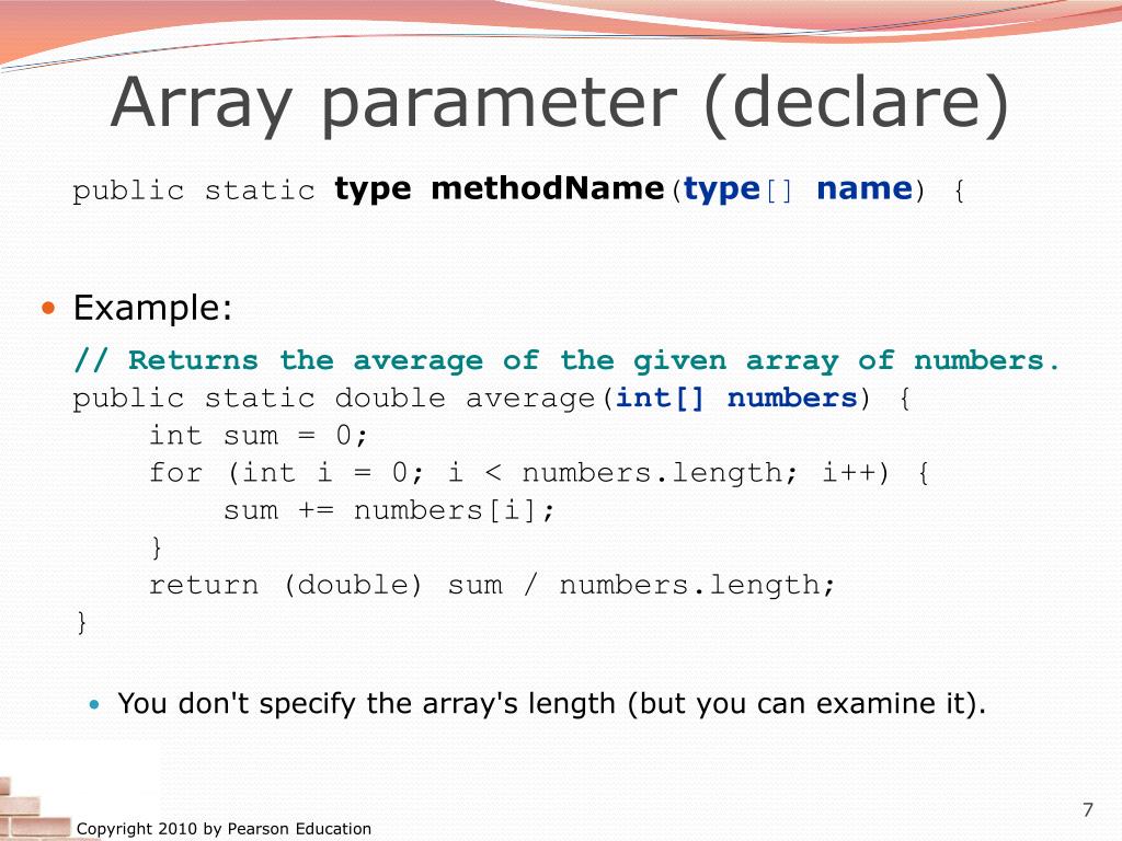 Array parameter (declare) public static typemethodName(type[] name) { Example: // Returns the average of the given array of numbers. public static double average(int[] numbers) { int sum = 0; for (int i = 0; i < numbers.length; i++) { sum += numbers[i]; } return (double) sum / numbers.length; } You don't specify the array's length (but you can examine it).