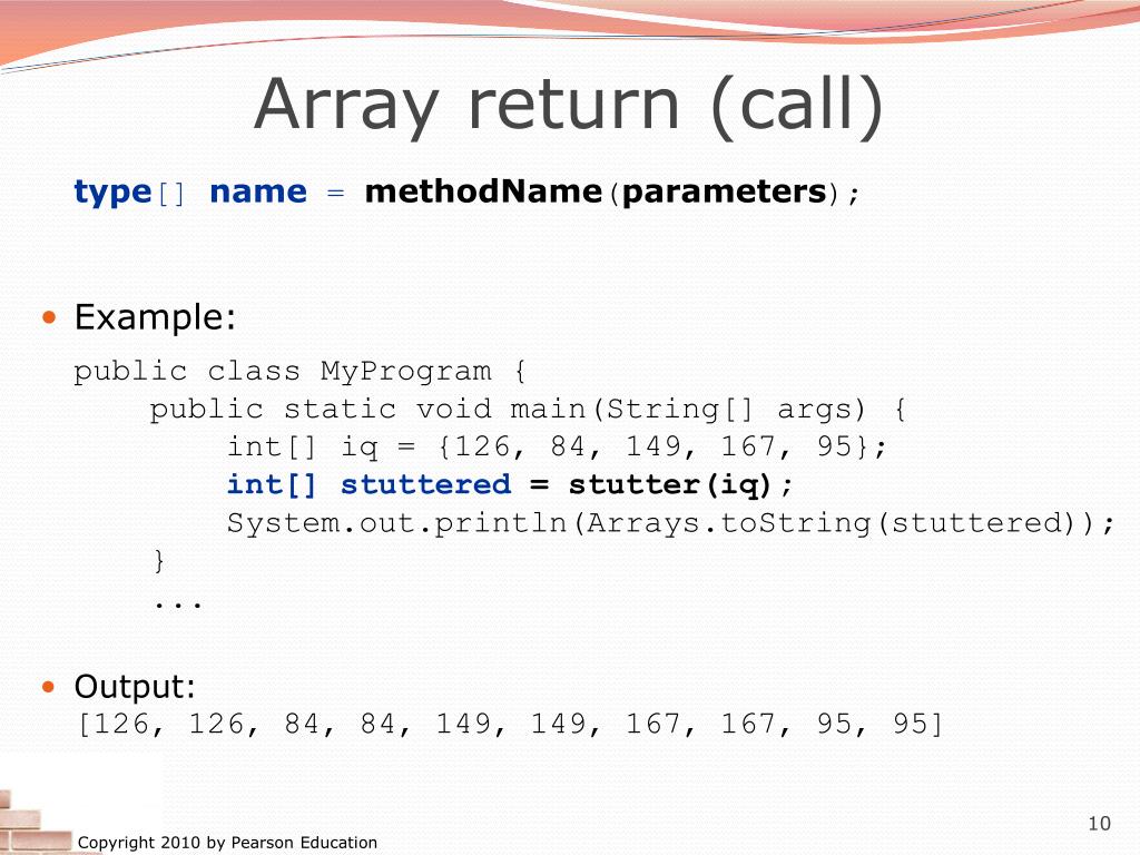 Array return (call) type[] name =methodName(parameters); Example: public class MyProgram { public static void main(String[] args) { int[] iq = {126, 84, 149, 167, 95}; int[] stuttered = stutter(iq); System.out.println(Arrays.toString(stuttered)); } ... Output: [126, 126, 84, 84, 149, 149, 167, 167, 95, 95]