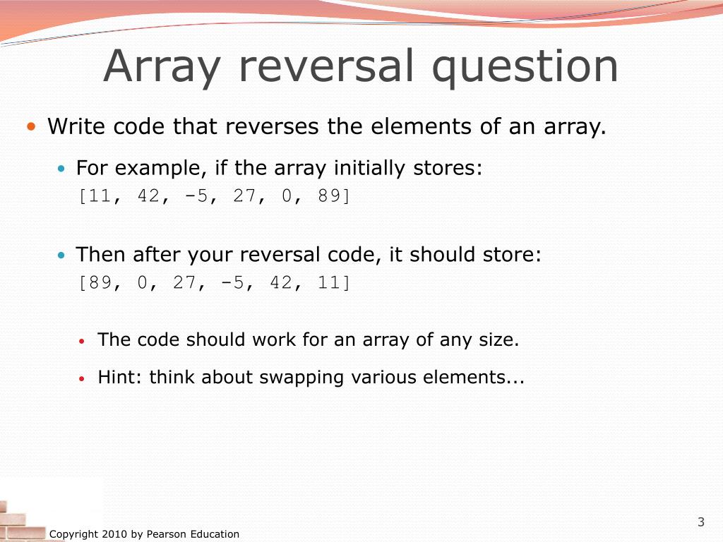 Array reversal question • Write code that reverses the elements of an array. • For example, if the array initially stores: [11, 42, -5, 27, 0, 89] • Then after your reversal code, it should store: [89, 0, 27, -5, 42, 11] • The code should work for an array of any size. • Hint: think about swapping various elements...