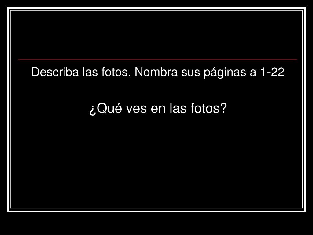 Describa las fotos. Nombra sus páginas a 1-22 ¿Qué ves en las fotos?