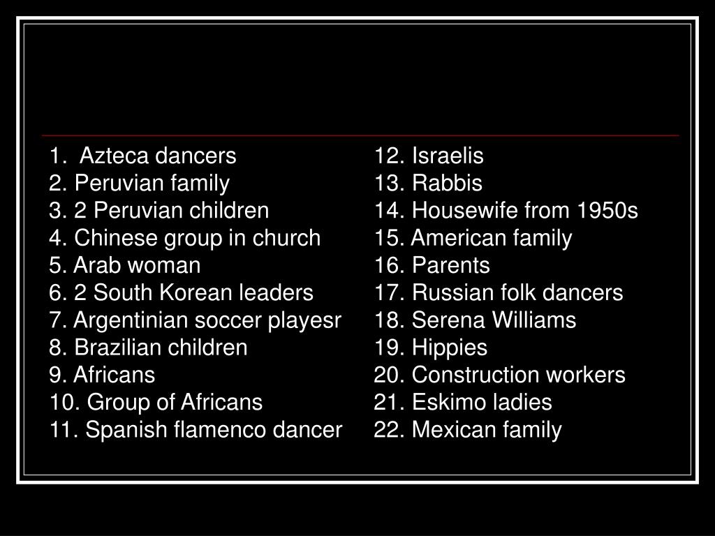 1. Azteca dancers 2. Peruvian family 3. 2 Peruvian children 4. Chinese group in church 5. Arab woman 6. 2 South Korean leaders 7. Argentinian soccer playesr 8. Brazilian children 9. Africans 10. Group of Africans 11. Spanish flamenco dancer 12. Israelis 13. Rabbis 14. Housewife from 1950s 15. American family 16. Parents 17. Russian folk dancers 18. Serena Williams 19. Hippies 20. Construction workers 21. Eskimo ladies 22. Mexican family