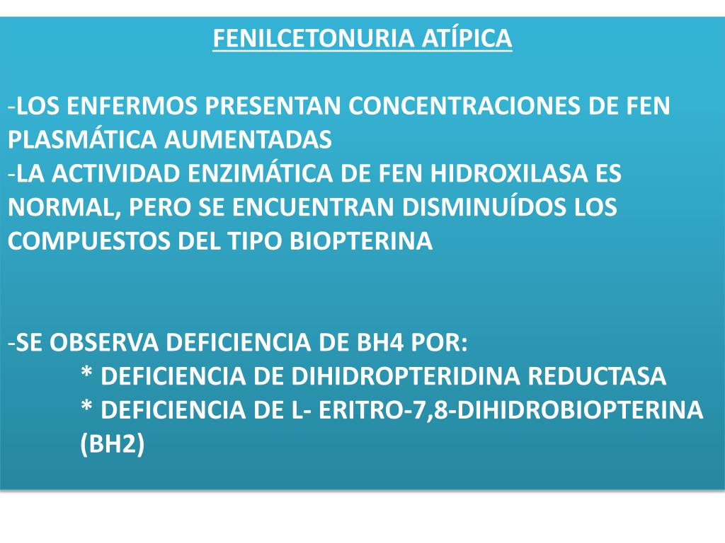 CARACTERÍSTICAS CLÍNICAS • DETERIORO NEUROLÓGICO PROGRESIVO: RETARDO MENTAL • NO RESPONDE AL TRATAMIENTO DIETARIO • MUEREN A TEMPRANA EDAD, CON CONVULSIONES, HIPOTONÍA Y PÉRDIDA DE PESO • BH4 ES FACTOR DE FEN HIDROXILASA Y DE TRIPTOFANO-5-HIDROXILASA (SÍNTESIS DE NEUROTRANSMISORES)