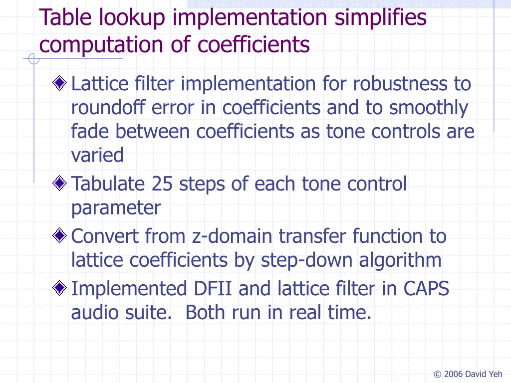 Table lookup implementation simplifies computation of coefficients • Lattice filter implementation for robustness to roundoff error in coefficients and to smoothly fade between coefficients as tone controls are varied • Tabulate 25 steps of each tone control parameter • Convert from z-domain transfer function to lattice coefficients by step-down algorithm • Implemented DFII and lattice filter in CAPS audio suite. Both run in real time.