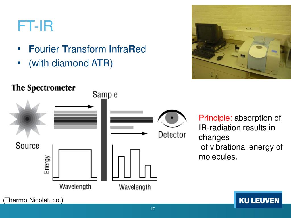 FT-IR Principle: absorption of IR-radiation results in changes of vibrational energy of molecules. (Thermo Nicolet, co.) Fourier Transform InfraRed (with diamond ATR)