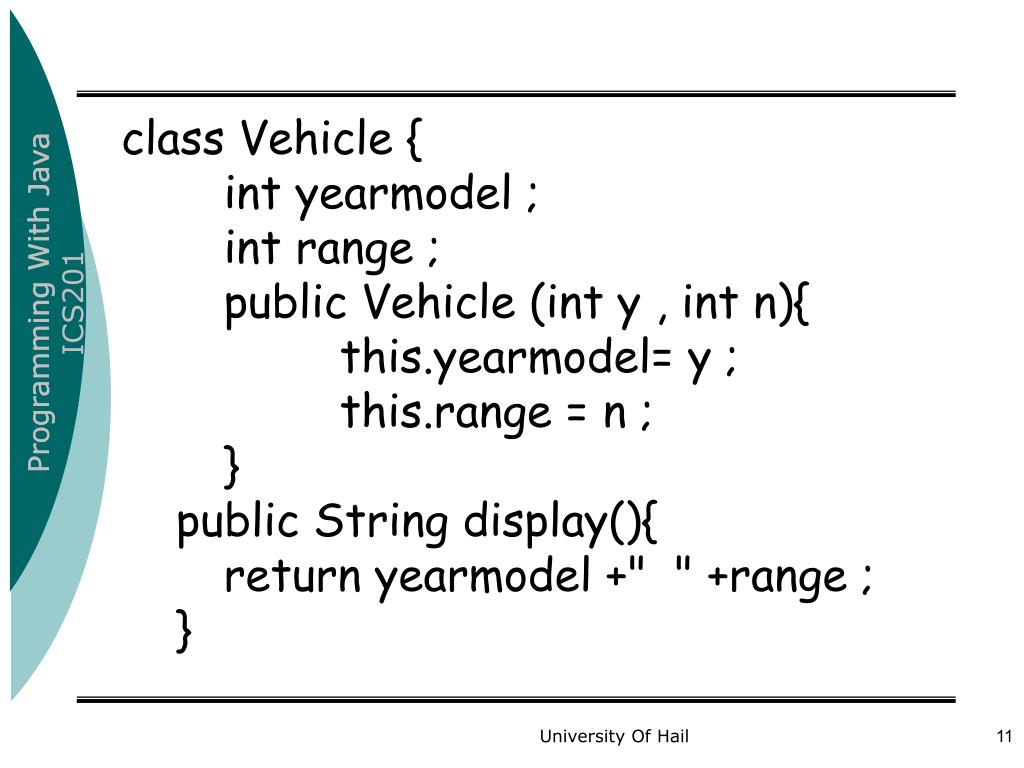 class Vehicle { intyearmodel ; int range ; public Vehicle (int y , int n){ this.yearmodel= y ; this.range = n ; } public String display(){ return yearmodel +" " +range ; } University Of Hail