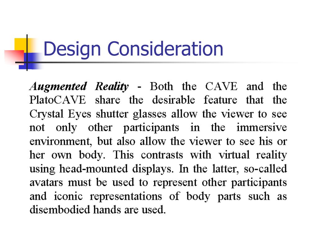 PlatoCAVE The PlatoCAVE is an example of an augmented reality environment. We say “augmented reality” because the shutter glasses are transparent when being used. So not only is the wearer able to see the computer generated images in stereoscopic 3-D, but also the real environment including others in the PlatoCAVE and also his or her own body. This is generally not possible with HMDs.