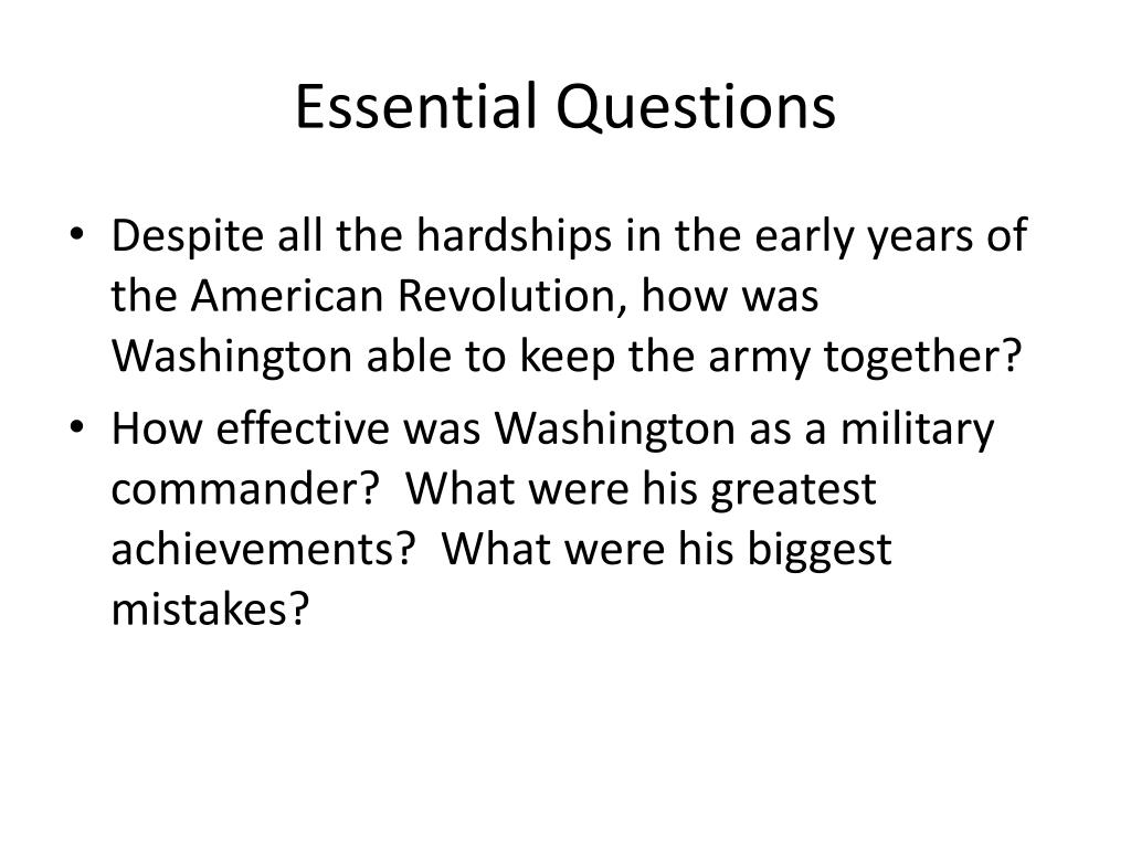 Essential Questions • Despite all the hardships in the early years of the American Revolution, how was Washington able to keep the army together? • How effective was Washington as a military commander? What were his greatest achievements? What were his biggest mistakes?
