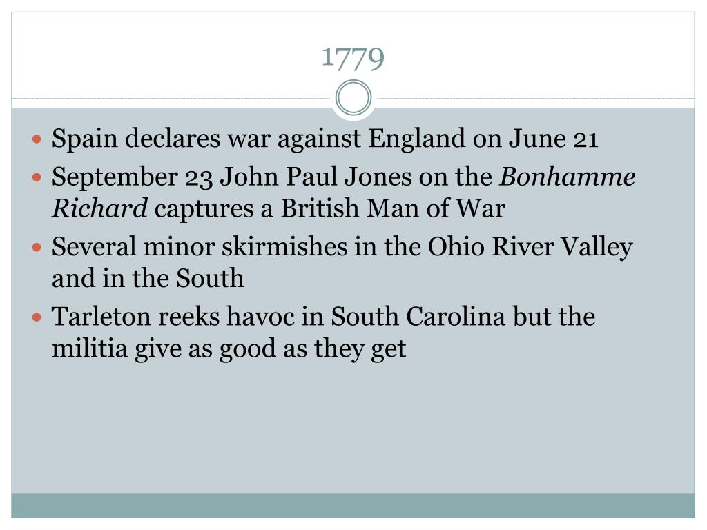 1779 Spain declares war against England on June 21 September 23 John Paul Jones on the Bonhamme Richard captures a British Man of War Several minor skirmishes in the Ohio River Valley and in the South Tarleton reeks havoc in South Carolina but the militia give as good as they get