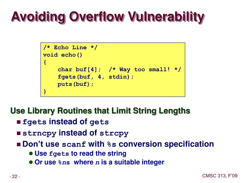 Avoiding Overflow Vulnerability • Use Library Routines that Limit String Lengths • fgets instead of gets • strncpy instead of strcpy • Don’t use scanf with %s conversion specification • Use fgets to read the string • Or use %ns where n is a suitable integer /* Echo Line */void echo(){ char buf[4]; /* Way too small! */ fgets(buf, 4, stdin); puts(buf);}