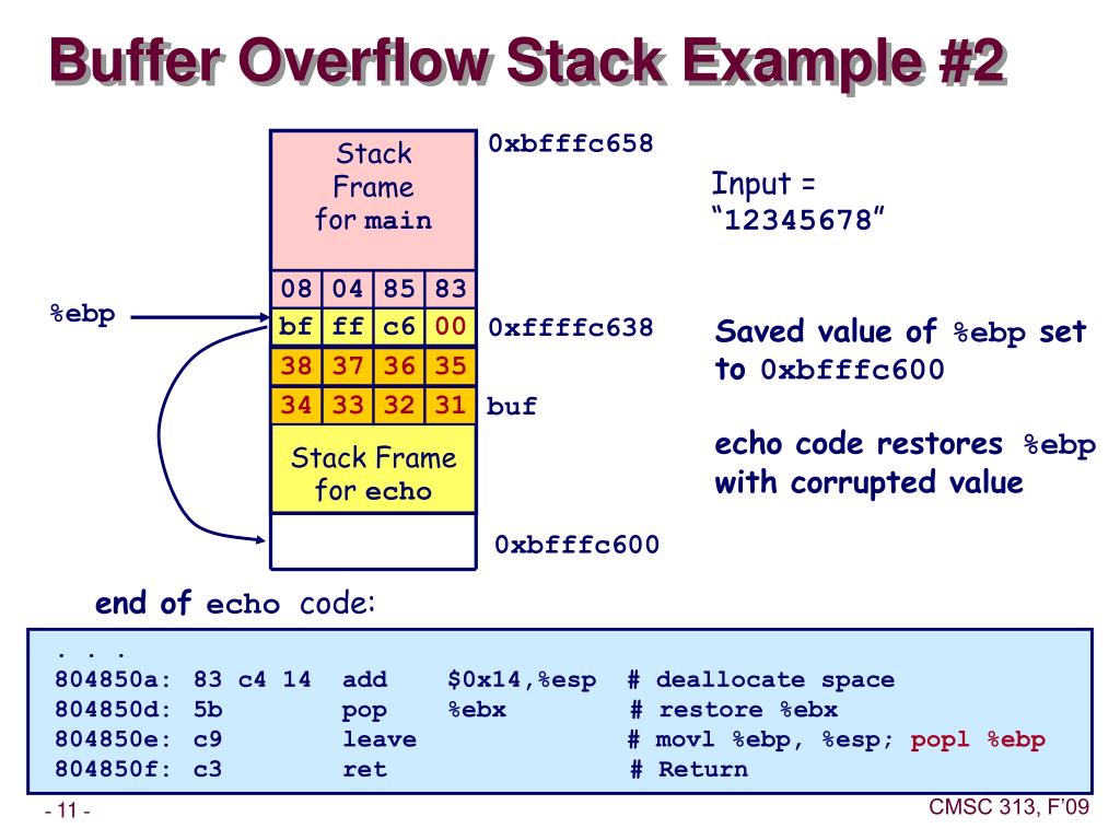 Example #2 Failure 0xbfffc658 Stack Frame for main Input = “12345678” %esp echo code restores %ebp with corrupted value Subsequent references based on %ebp invalid 0xbfffc600 %ebp xx xx xx xx Return from echo: 80485f2: e8 f9 fe ff ff call 80484f0 <echo> 80485f7: 8b 5d fc mov 0xfffffffc(%ebp),%ebx # bad ref? 80485fa: c9 leave # movl %ebp,%esp; popl %ebp 80485fb: 31 c0 xor %eax,%eax 80485fd: c3 ret # bad ref