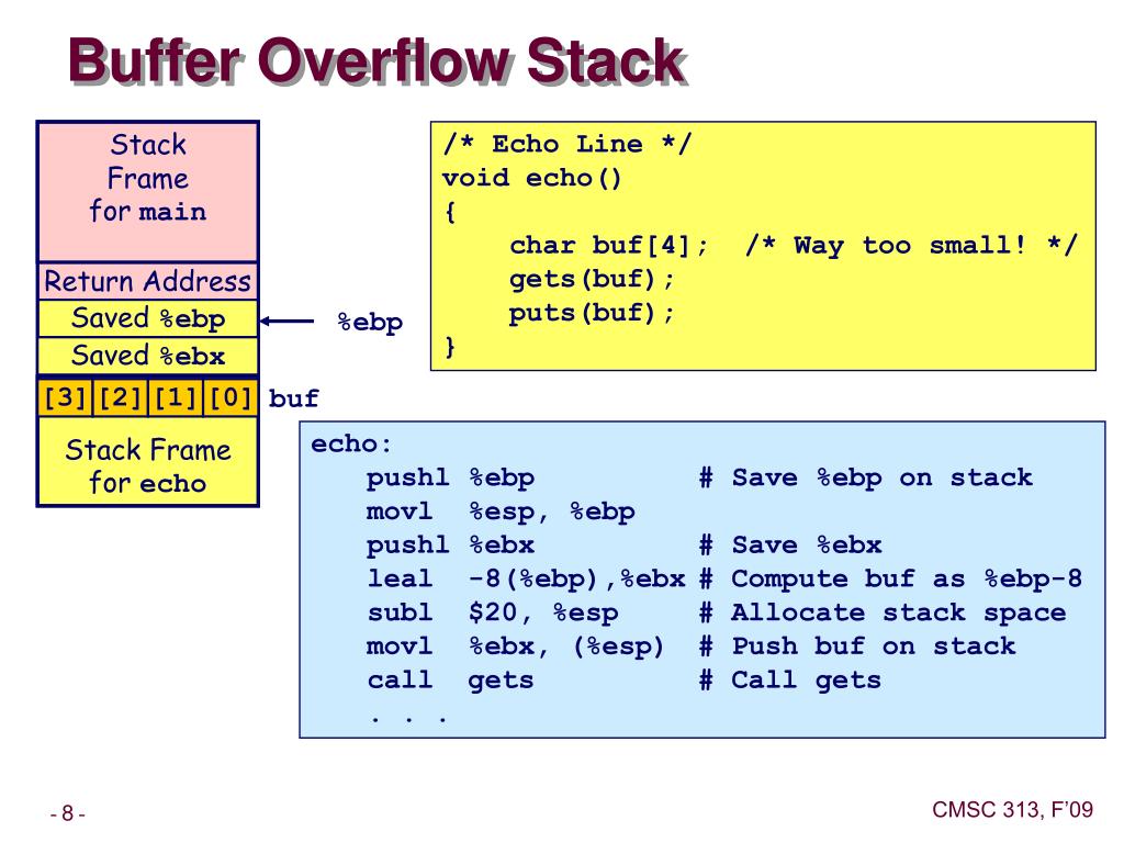 Buffer Overflow Stack Stack Frame for main /* Echo Line */void echo(){ char buf[4]; /* Way too small! */ gets(buf); puts(buf);} Return Address Saved %ebp %ebp Saved %ebx Stack Frame for echo buf [3] [2] [1] [0] echo: pushl %ebp # Save %ebp on stack movl %esp, %ebp pushl %ebx # Save %ebx leal -8(%ebp),%ebx # Compute buf as %ebp-8 subl $20, %esp # Allocate stack space movl %ebx, (%esp) # Push buf on stack call gets # Call gets . . .