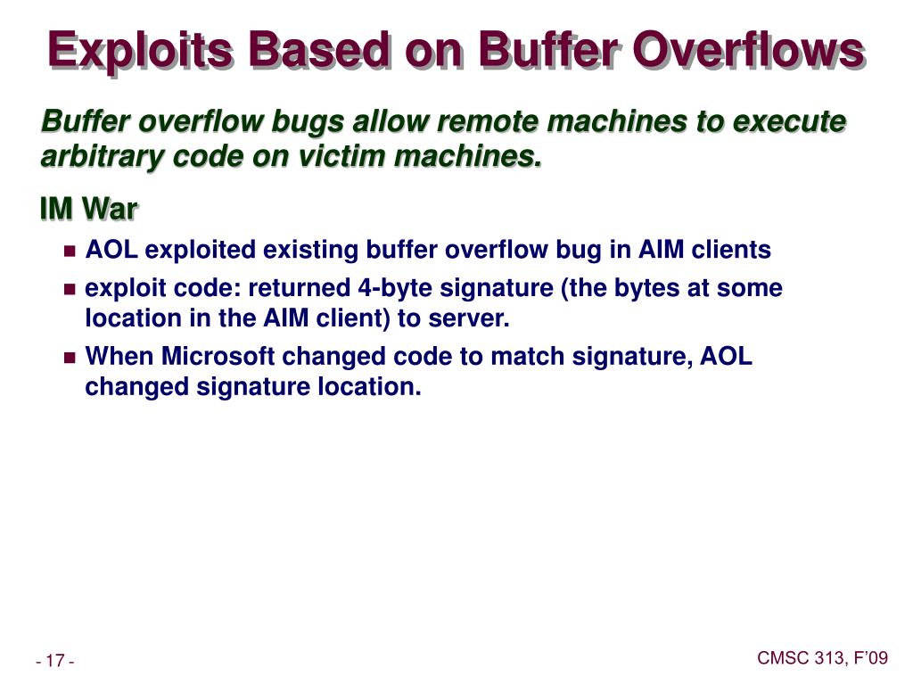 Exploits Based on Buffer Overflows • Buffer overflow bugs allow remote machines to execute arbitrary code on victim machines. • IM War • AOL exploited existing buffer overflow bug in AIM clients • exploit code: returned 4-byte signature (the bytes at some location in the AIM client) to server. • When Microsoft changed code to match signature, AOL changed signature location.