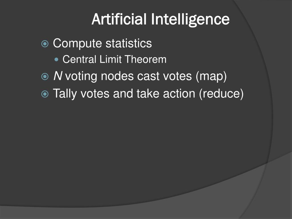 Artificial Intelligence • Compute statistics • Central Limit Theorem • N voting nodes cast votes (map) • Tally votes and take action (reduce)