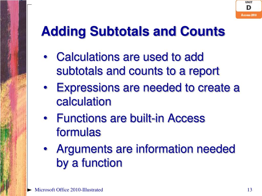 Adding Subtotals and Counts • Calculations are used to add subtotals and counts to a report • Expressions are needed to create a calculation • Functions are built-in Access formulas • Arguments are information needed by a function Microsoft Office 2010-Illustrated