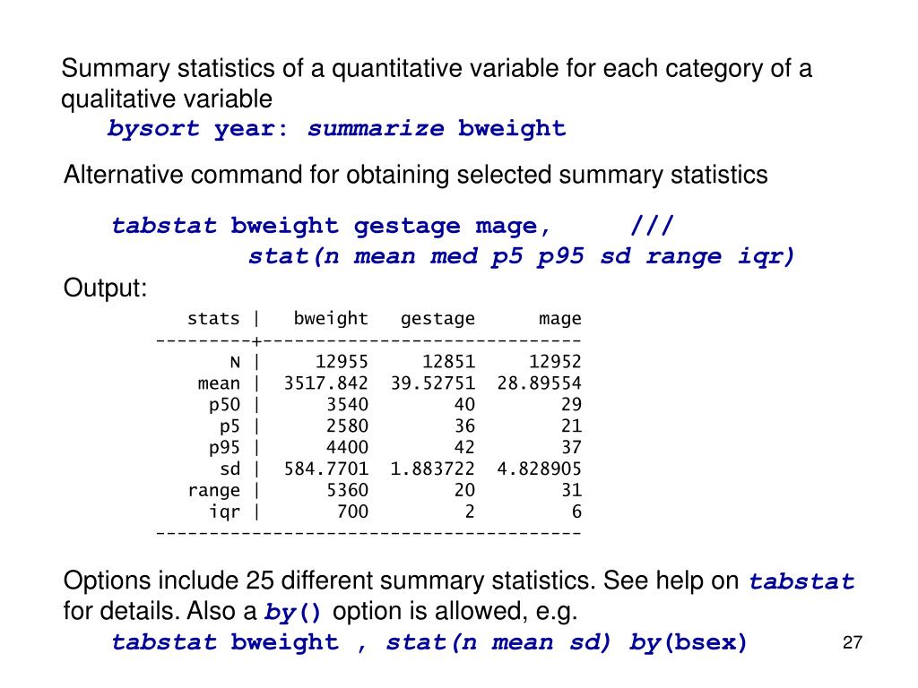 Summary statistics of a quantitative variable for each category of a • qualitative variable • bysort year: summarize bweight • Alternative command for obtaining selected summary statistics • tabstat bweight gestage mage, /// • stat(n mean med p5 p95 sd range iqr) • Output: • stats | bweight gestage mage • ---------+------------------------------ • N | 12955 12851 12952 • mean | 3517.842 39.52751 28.89554 • p50 | 3540 40 29 • p5 | 2580 36 21 • p95 | 4400 42 37 • sd | 584.7701 1.883722 4.828905 • range | 5360 20 31 • iqr | 700 2 6 • ---------------------------------------- • Options include 25 different summary statistics. See help on tabstat • for details. Also a by() option is allowed, e.g. • tabstat bweight , stat(n mean sd)by(bsex)