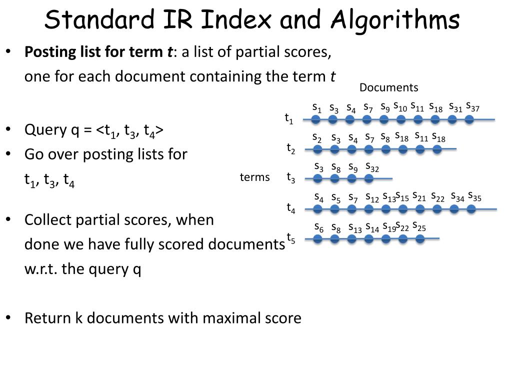 Standard IR Index and Algorithms Documents • Posting list for term t: a list of partial scores, one for each document containing the term t • Query q = <t1, t3, t4> • Go over posting lists for t1, t3, t4 • Collect partial scores, when done we have fully scored documents w.r.t. the query q • Return k documents with maximal score s10 s11 s37 s18 s31 s9 s7 s1 s4 s3 t1 s18 s11 s18 s8 s7 s2 s4 s3 t2 terms s32 s3 s9 s8 t3 s15 s21 s35 s22 s34 s13 s12 s4 s7 s5 t4 s22 s25 s19 s14 s6 s13 s8 t5