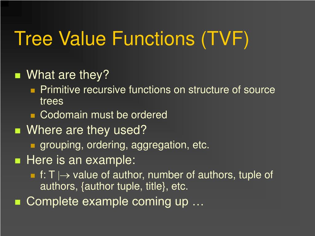 Tree Value Functions (TVF) • What are they? • Primitive recursive functions on structure of source trees • Codomain must be ordered • Where are they used? • grouping, ordering, aggregation, etc. • Here is an example: • f: T value of author, number of authors, tuple of authors, {author tuple, title}, etc. • Complete example coming up …