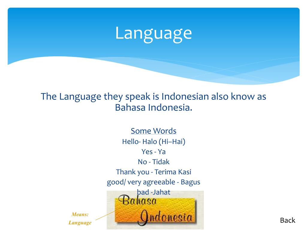 Language Means: Language The Language they speak is Indonesian also know as Bahasa Indonesia. Some Words Hello- Halo (Hi–Hai) Yes - Ya No - Tidak Thank you - Terima Kasi good/ very agreeable - Bagus bad -Jahat Back