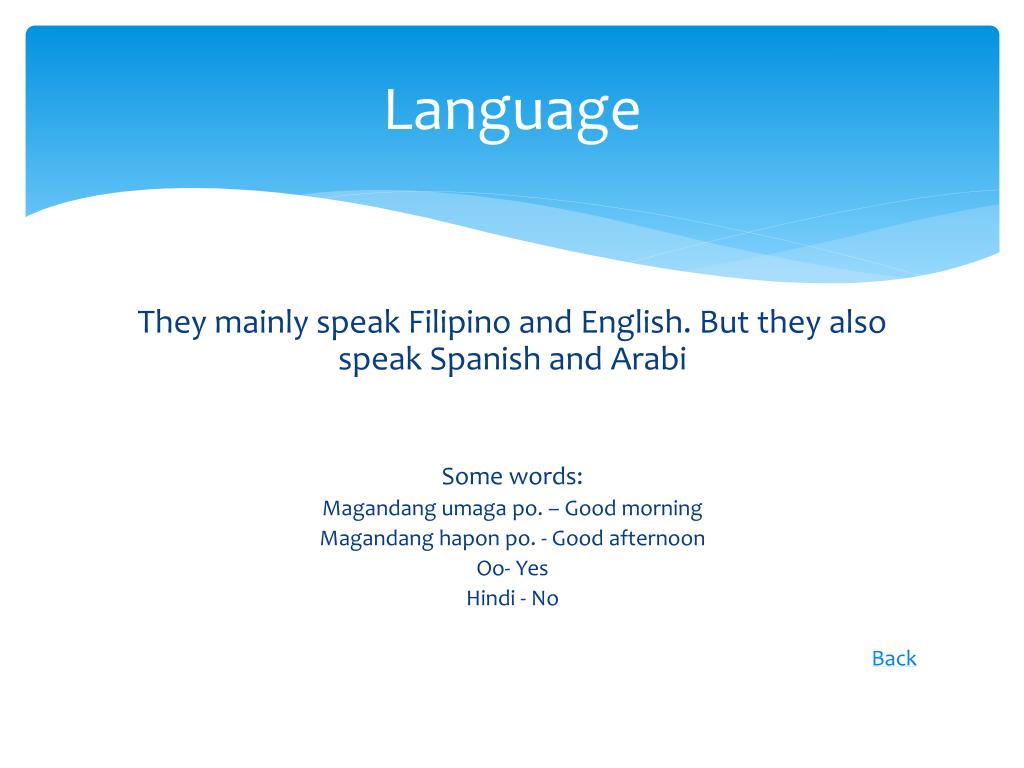 Language They mainly speak Filipino and English. But they also speak Spanish and Arabi Some words: Magandang umaga po. – Good morning Magandang hapon po. - Good afternoon Oo- Yes Hindi - No Back