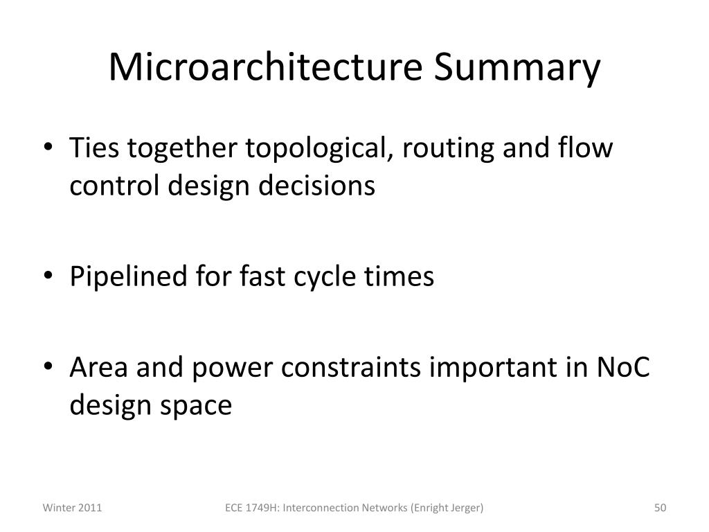 Microarchitecture Summary • Ties together topological, routing and flow control design decisions • Pipelined for fast cycle times • Area and power constraints important in NoC design space ECE 1749H: Interconnection Networks (Enright Jerger)