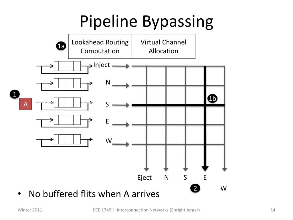 Pipeline Bypassing Lookahead Routing Computation Virtual Channel Allocation 1a • No buffered flits when A arrives Inject N 1 1b A S E W N S E Eject W 2 ECE 1749H: Interconnection Networks (Enright Jerger)