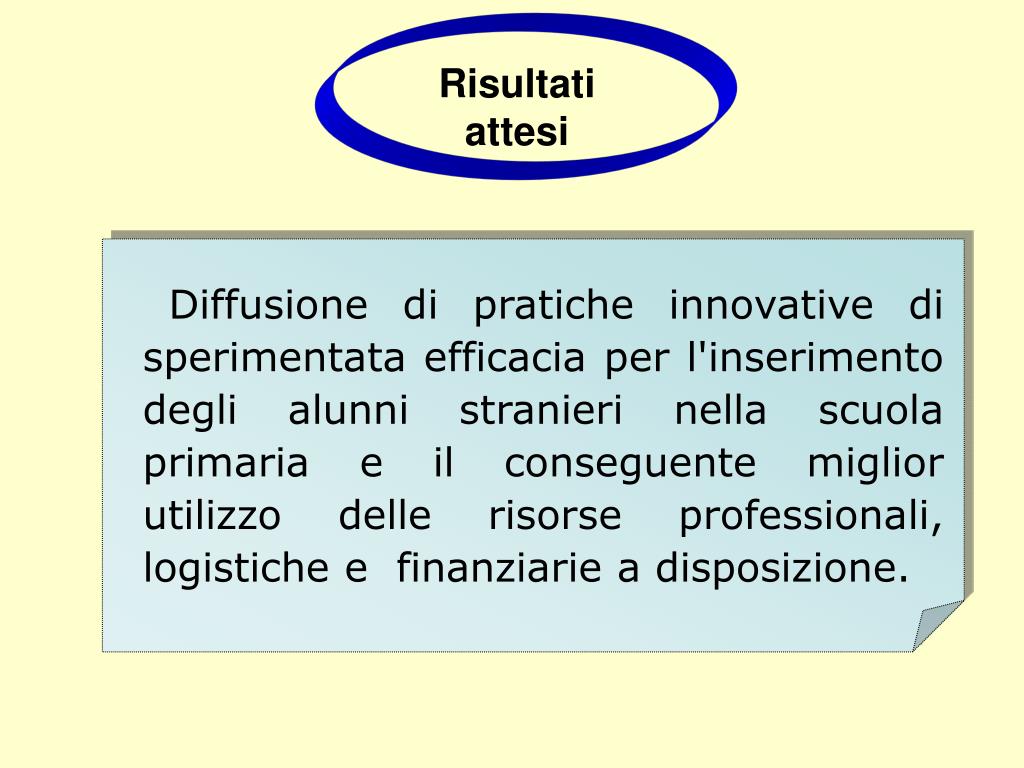 Risultati attesi Diffusione di pratiche innovative di sperimentata efficacia per l'inserimento degli alunni stranieri nella scuola primaria e il conseguente miglior utilizzo delle risorse professionali, logistiche e finanziarie a disposizione.