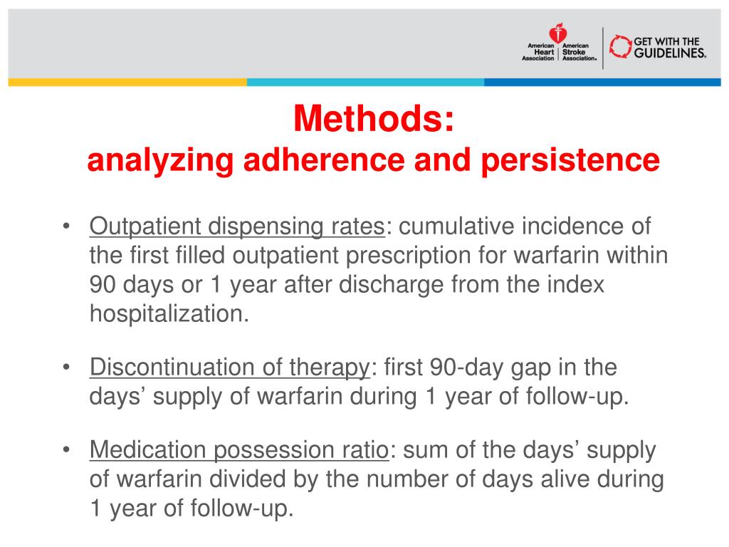 Methods:analyzing adherence and persistence • Outpatient dispensing rates: cumulative incidence of the first filled outpatient prescription for warfarin within 90 days or 1 year after discharge from the index hospitalization. • Discontinuation of therapy: first 90-day gap in the days’ supply of warfarin during 1 year of follow-up. • Medication possession ratio: sum of the days’ supply of warfarin divided by the number of days alive during 1 year of follow-up.