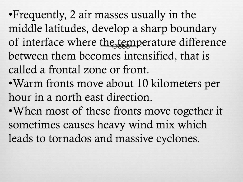 Frequently, 2 air masses usually in the middle latitudes, develop a sharp boundary of interface where the temperature difference between them becomes intensified, that is called a frontal zone or front. • Warm fronts move about 10 kilometers per hour in a north east direction. • When most of these fronts move together it sometimes causes heavy wind mix which leads to tornados and massive cyclones.