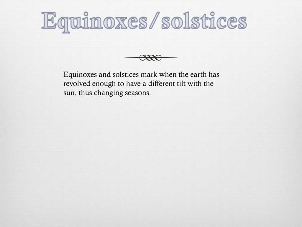 Equinoxes/solstices Equinoxes and solstices mark when the earth has revolved enough to have a different tilt with the sun, thus changing seasons.