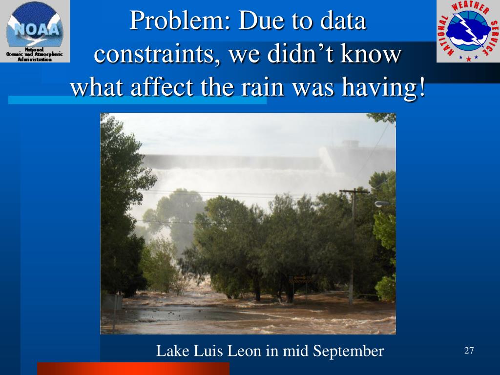 Problem: Due to data constraints, we didn’t know what affect the rain was having! Lake Luis Leon in mid September