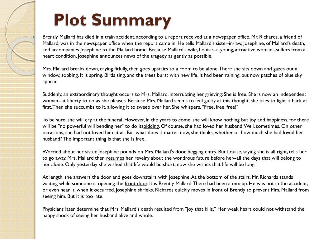 Plot Summary • Brently Mallard has died in a train accident, according to a report received at a newspaper office. Mr. Richards, a friend of Mallard, was in the newspaper office when the report came in. He tells Mallard's sister-in-law, Josephine, of Mallard's death, and accompanies Josephine to the Mallard home. Because Mallard's wife, Louise--a young, attractive woman--suffers from a heart condition, Josephine announces news of the tragedy as gently as possible.Mrs. Mallard breaks down, crying fitfully, then goes upstairs to a room to be alone. There she sits down and gazes out a window, sobbing. It is spring. Birds sing, and the trees burst with new life. It had been raining, but now patches of blue sky appear.Suddenly, an extraordinary thought occurs to Mrs. Mallard, interrupting her grieving: She is free. She is now an independent woman--at liberty to do as she pleases. Because Mrs. Mallard seems to feel guilty at this thought, she tries to fight it back at first. Then she succumbs to it, allowing it to sweep over her. She whispers, "Free, free, free!"To be sure, she will cry at the funeral. However, in the years to come, she will know nothing but joy and happiness, for there will be "no powerful will bending her" to do itsbidding. Of course, she had loved her husband. Well, sometimes. On other occasions, she had not loved him at all. But what does it matter now, she thinks, whether or how much she had loved her husband? The important thing is that she is free.Worried about her sister, Josephine pounds on Mrs. Mallard's door, begging entry. But Louise, saying she is all right, tells her to go away. Mrs. Mallard then resumes her revelry about the wondrous future before her--all the days that will belong to her alone. Only yesterday she wished that life would be short; now she wishes that life will be long.At length, she answers the door and goes downstairs with Josephine. At the bottom of the stairs, Mr. Richards stands waiting while someone is opening the front door. It is Brently Mallard. There had been a mix-up. He was not in the accident, or even near it, when it occurred. Josephine shrieks. Richards quickly moves in front of Brently to prevent Mrs. Mallard from seeing him. But it is too late.Physicians later determine that Mrs. Mallard's death resulted from "joy that kills." Her weak heart could not withstand the happy shock of seeing her husband alive and whole.